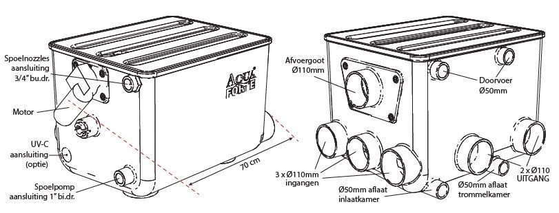 De Aquaforte Trommelfilter is geschikt voor zowel pomgevoede als zwaartekracht opstelling. Inlaatkamer en trommelkamer zijn beide