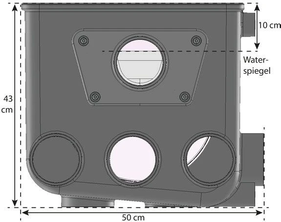 - Afmetingen incl. aansluitingen en motor: 50 x 70 x 43 cm