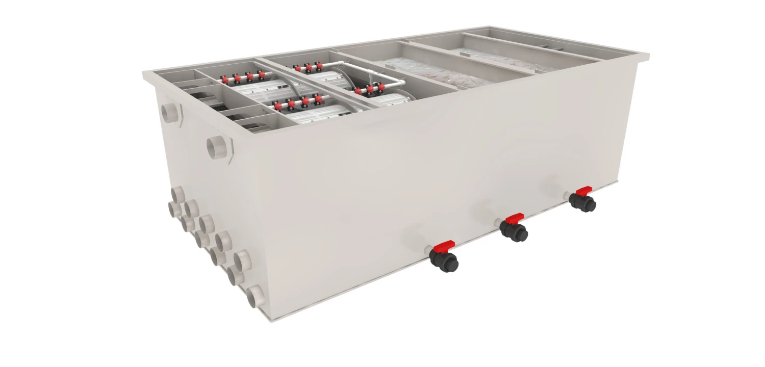 Het moving bed filter is een biologische filter en na verwijdering van het grove vuil door het drumfilter komt het water terecht in dit biologische filter. Hier worden schadelijke stoffen als ammonia en nitriet door bacteriën omgezet naar het ‘onschadelijke’ nitraat.