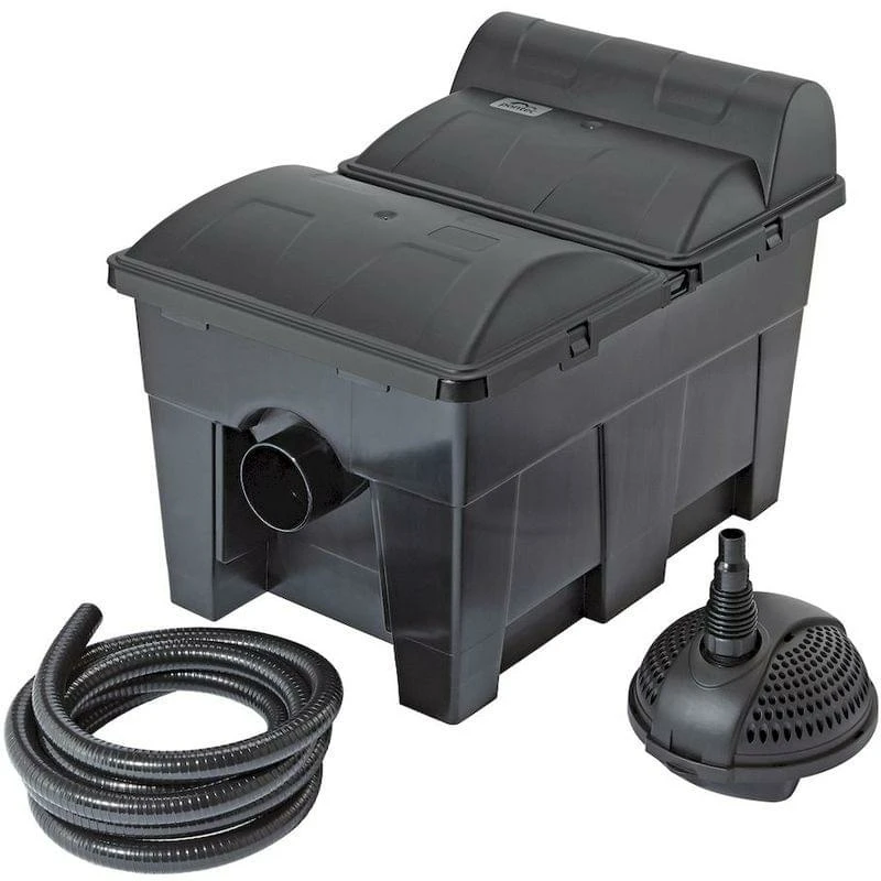 De vijverpomp met een capaciteit van 3500 liter vervoert het water naar het vijverfilter. Daarbij is de pomp in staat om vuildeeltjes tot 4 mm te transporteren. Met de 3 meter lange vijverslang sluit je de pomp aan op het filter.