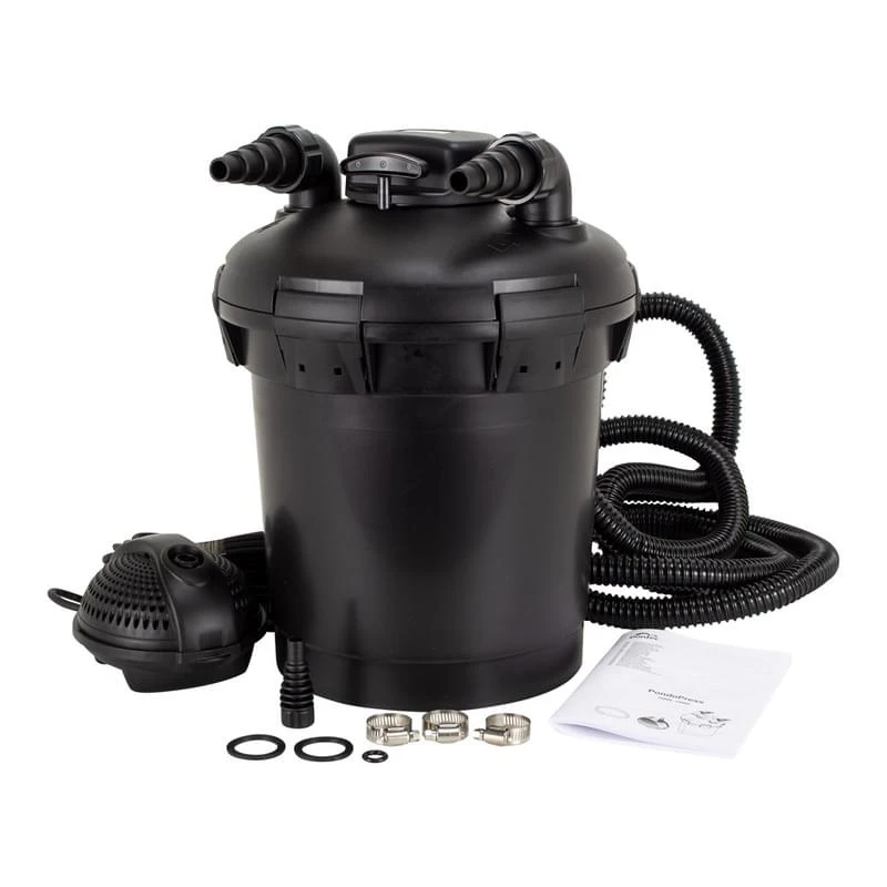De meegeleverde filterpomp kan maar liefst 2500 liter water per uur transporteren. Met de meegeleverde slang van 5 meter kan je de drukfilter en filterpomp met elkaar aansluiten. De pomp kan grove vuildeeltjes tot een grootte van 4 mm en andere vertroebelende of zwevende stoffen vervoeren.